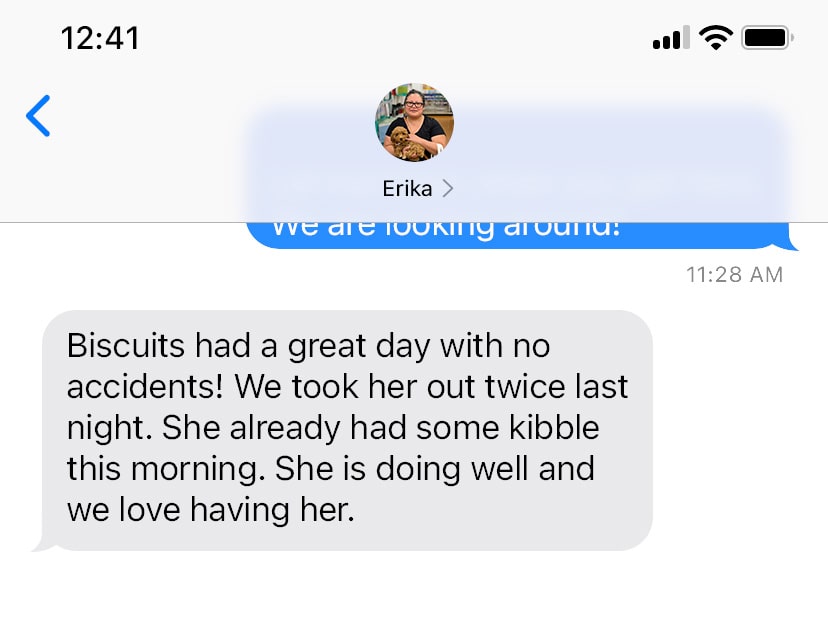 Biscuits had a great day with no accidents! We took her out twice last night. She already had some kibble this morning. She is doing well and we love having her.