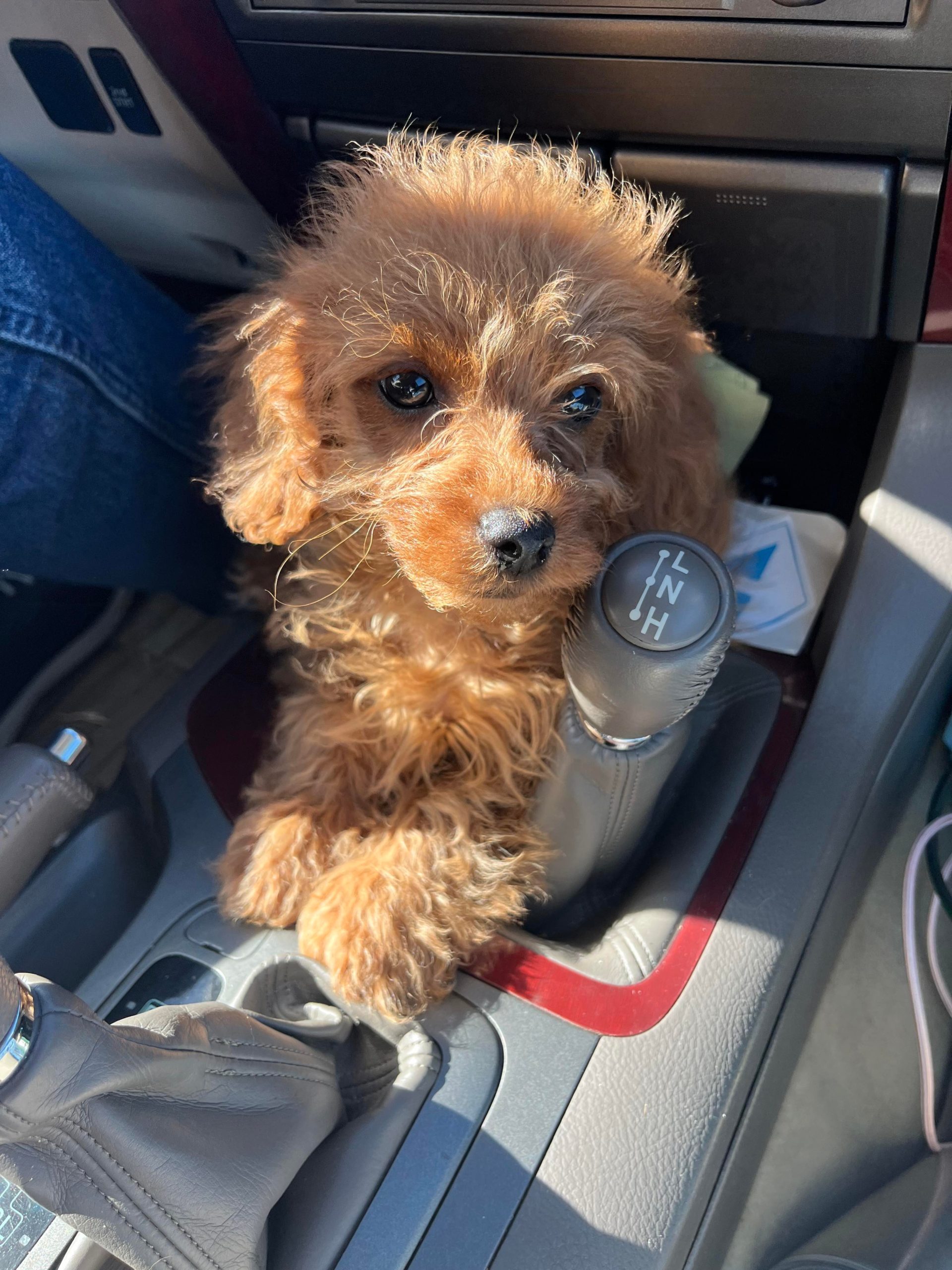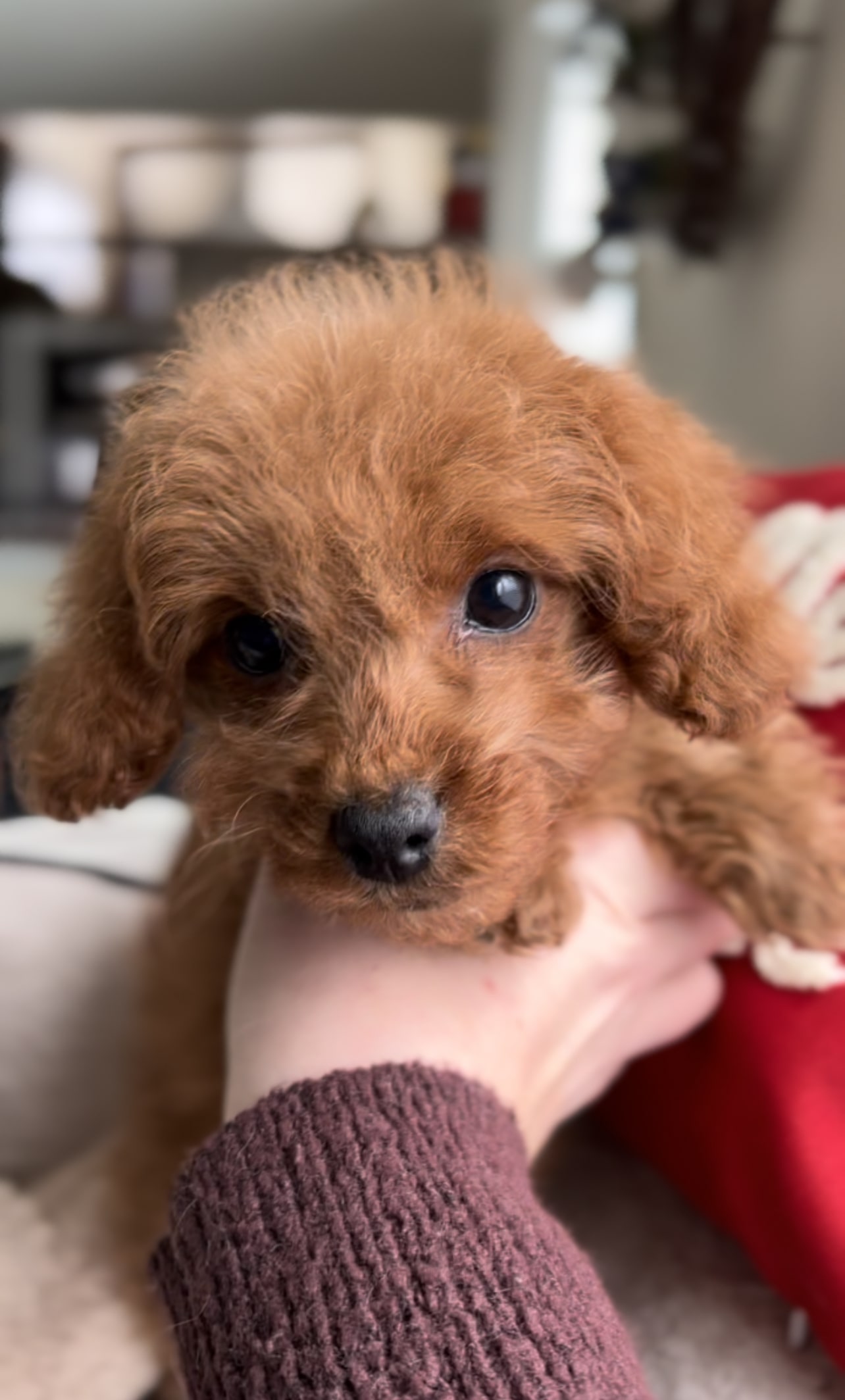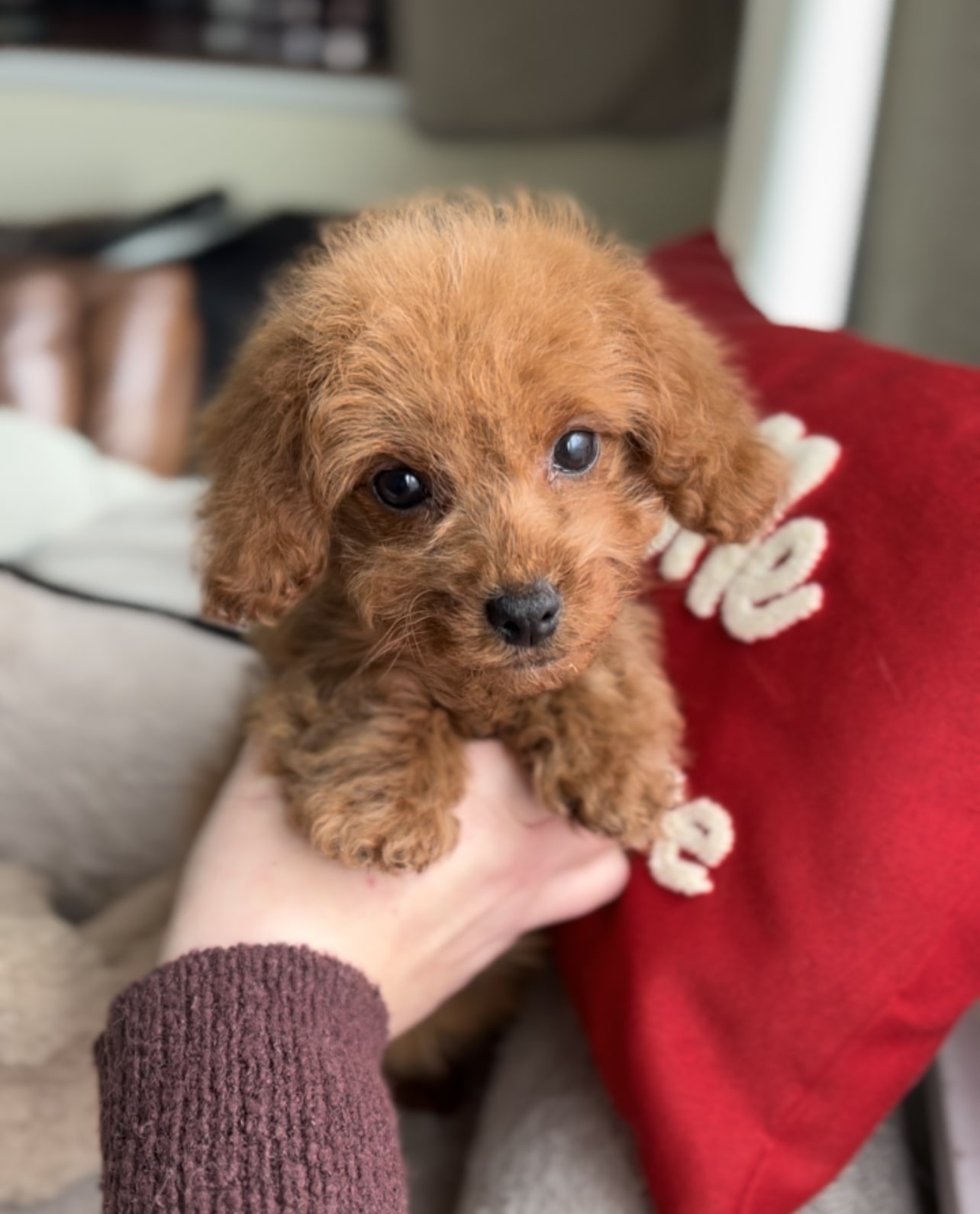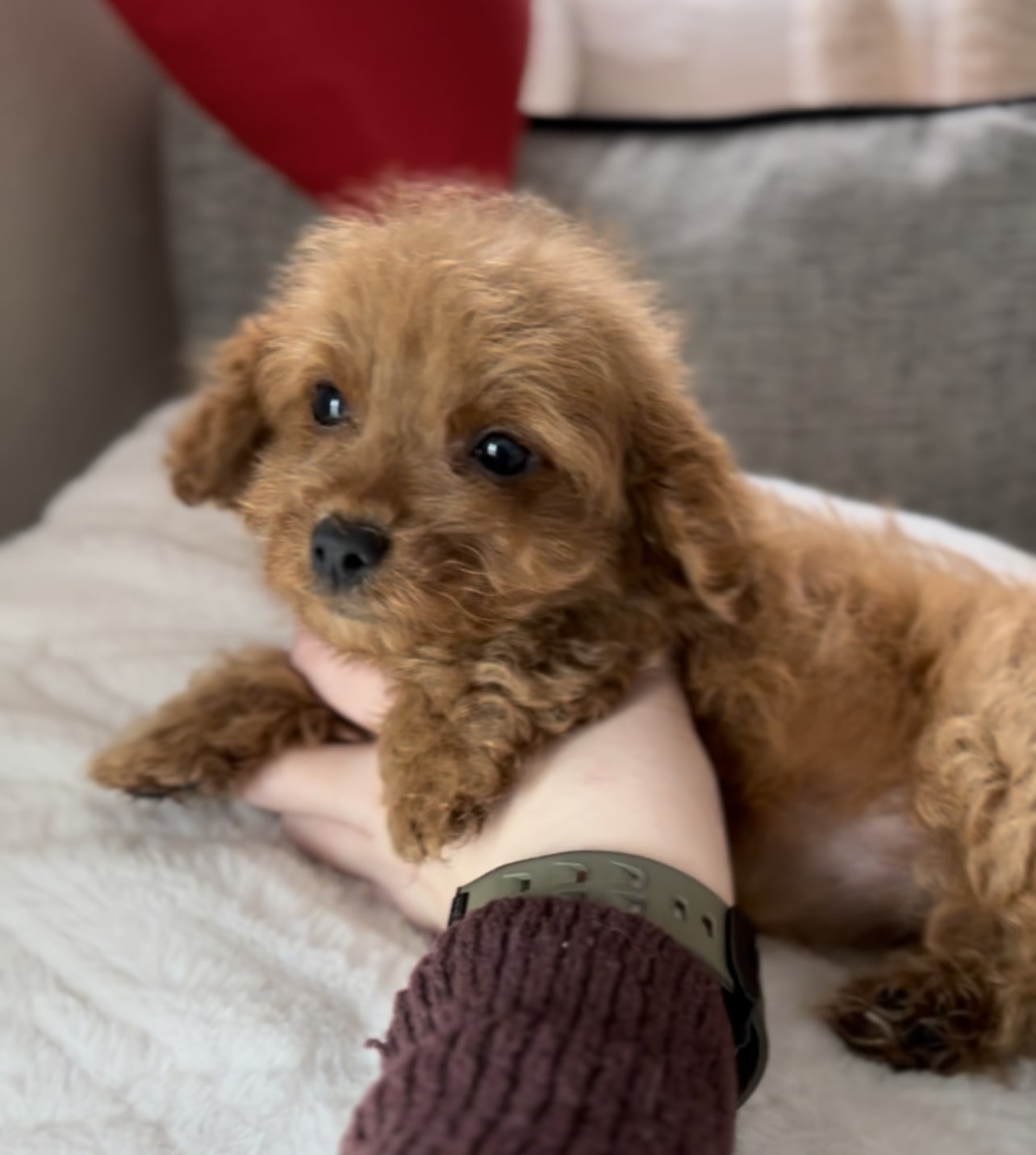 We had fostered several dogs when we lost our beloved Cockapoo. We loved our foster dogs dearly, however they had many behavioral problems due to abuse and mistreatment. We really wanted a clean slate with a puppy from a good breeder. That was our cavapoo puppy, Kitten! She is a very sweet, calm, and easy going puppy. She is a very happy girl, and although she was started on kennel training prior to coming home, she sleeps on the bed with us. We are retired so we spend all day with Kitten! She is spoiled!