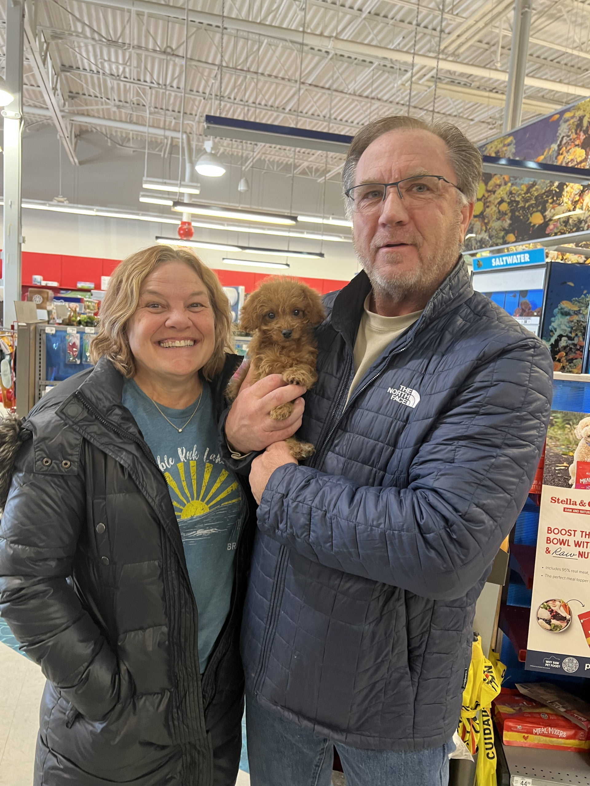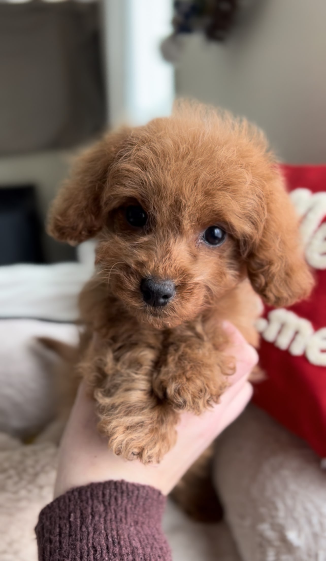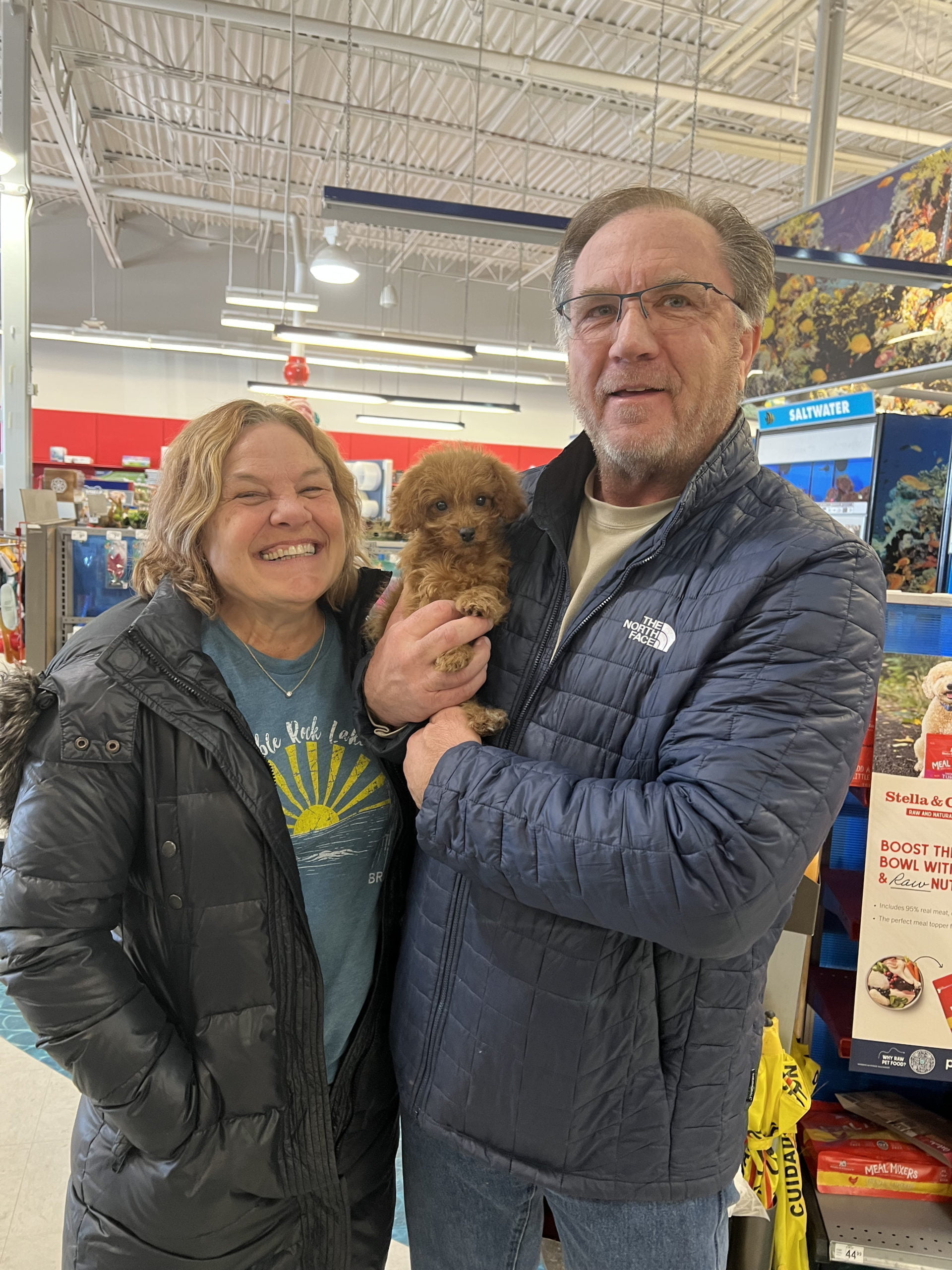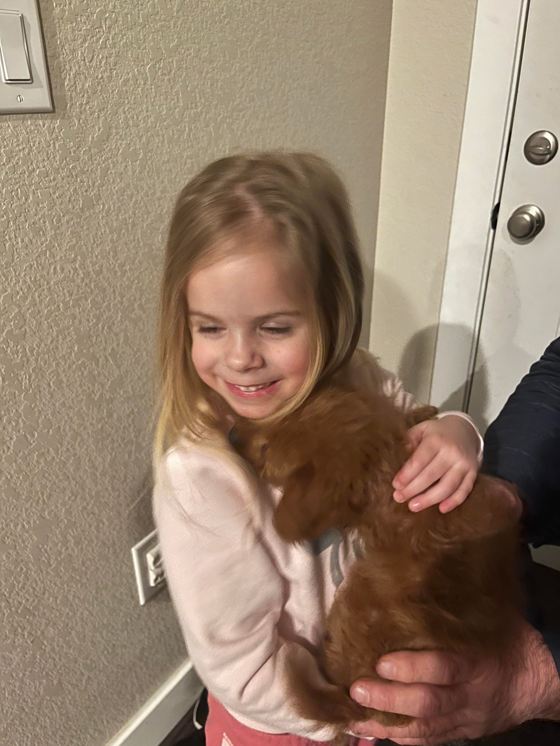 We had fostered several dogs when we lost our beloved Cockapoo. We loved our foster dogs dearly, however they had many behavioral problems due to abuse and mistreatment. We really wanted a clean slate with a puppy from a good breeder. That was our cavapoo puppy, Kitten! She is a very sweet, calm, and easy going puppy. She is a very happy girl, and although she was started on kennel training prior to coming home, she sleeps on the bed with us. We are retired so we spend all day with Kitten! She is spoiled!