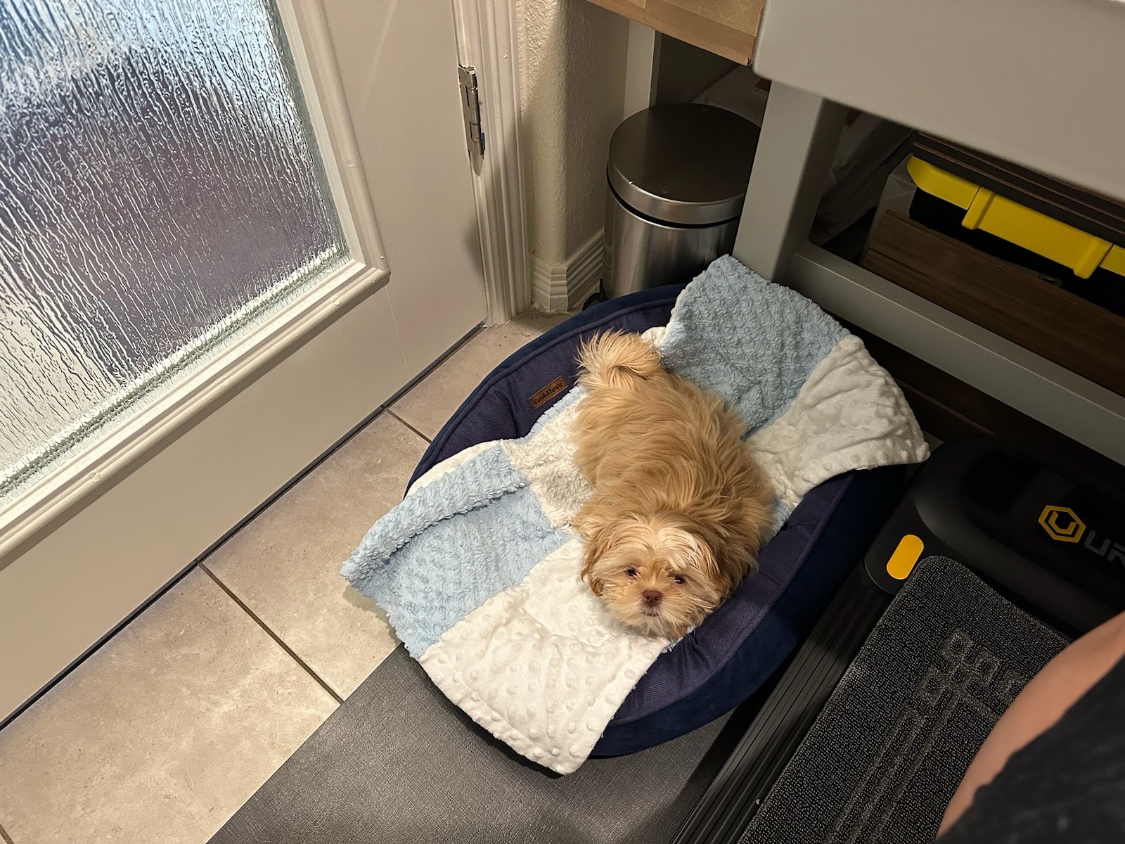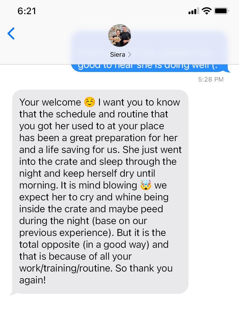 Grizzly slept so well in her crate inside my bedroom last night. John took her out at around 7 and she peed and pooped. I take her out every 2 hours and she peed. She is playful and loves chasing moving foot. She just sleeps a minute ago after eating and drinking. She loves sleeping in my office by my feet. ☺️ I want you to know that the schedule and routine that you got her used to at your place has been a great preparation for her and a life saving for us. She just went into the crate and sleep through the night and keep herself dry until morning. It is mind blowing 🤯 we expect her to cry and whine being inside the crate and maybe peed during the night (base on our previous experience). But it is the total opposite (in a good way) and that is because of all your work/training/routine. So thank you again!