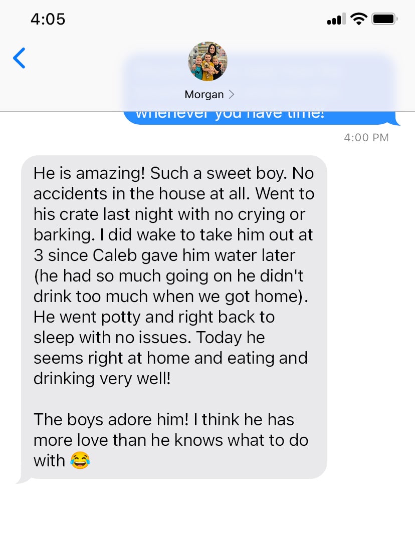 He is amazing! Such a sweet boy. No accidents in the house at all. Went to his crate last night with no crying or barking. I did wake to take him out at 3 since Caleb gave him water later (he had so much going on he didn’t drink too much when we got home). He went potty and right back to sleep with no issues. Today he seems right at home and eating and drinking very well!