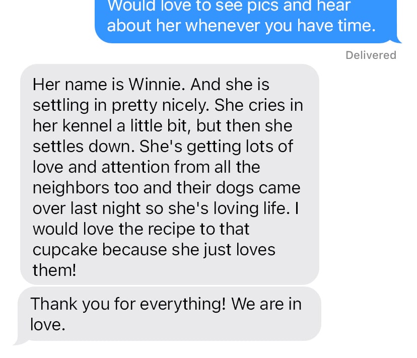 Thank you for everything! We are in love. She is settling in pretty nicely. She cries in her kennel a little bit, but then she settles down. She’s getting lots of love and attention from all the neighbors too and their dogs came over last night so she’s loving life. I would love the recipe to that cupcake because she just loves them!