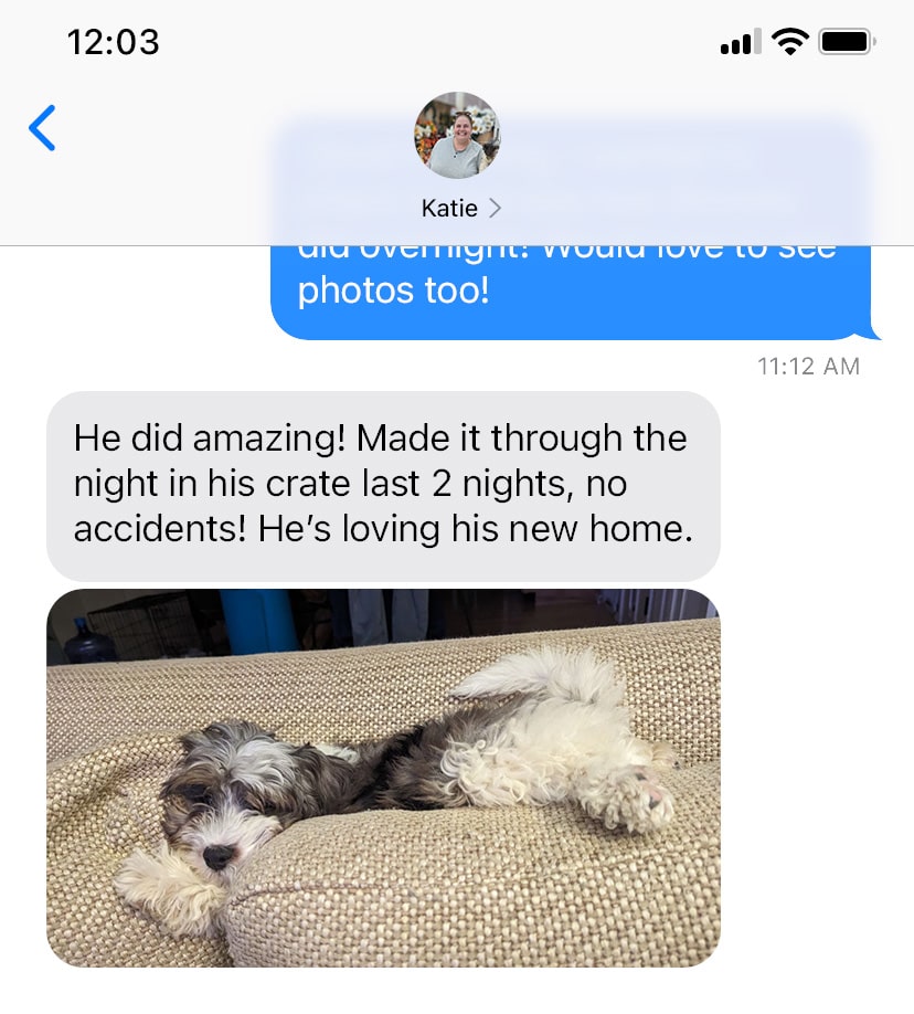 He did amazing! Made it through the night in his crate last 2 nights, no accidents! He’s loving his new home.