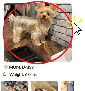 There is a full report of each Breeding Adult Dog on our ‘Meet The Parents’ Page. You can also access Parent information by simply clicking on the Photo of the Parent on their Litter Announcement Page. (Illustrated Below)